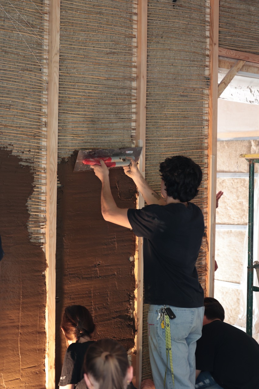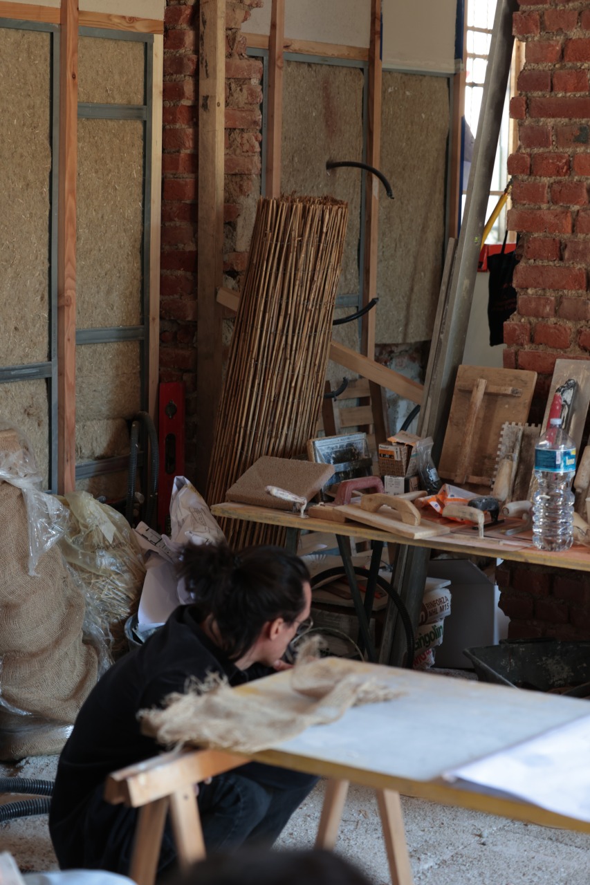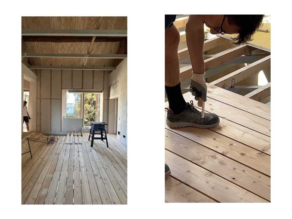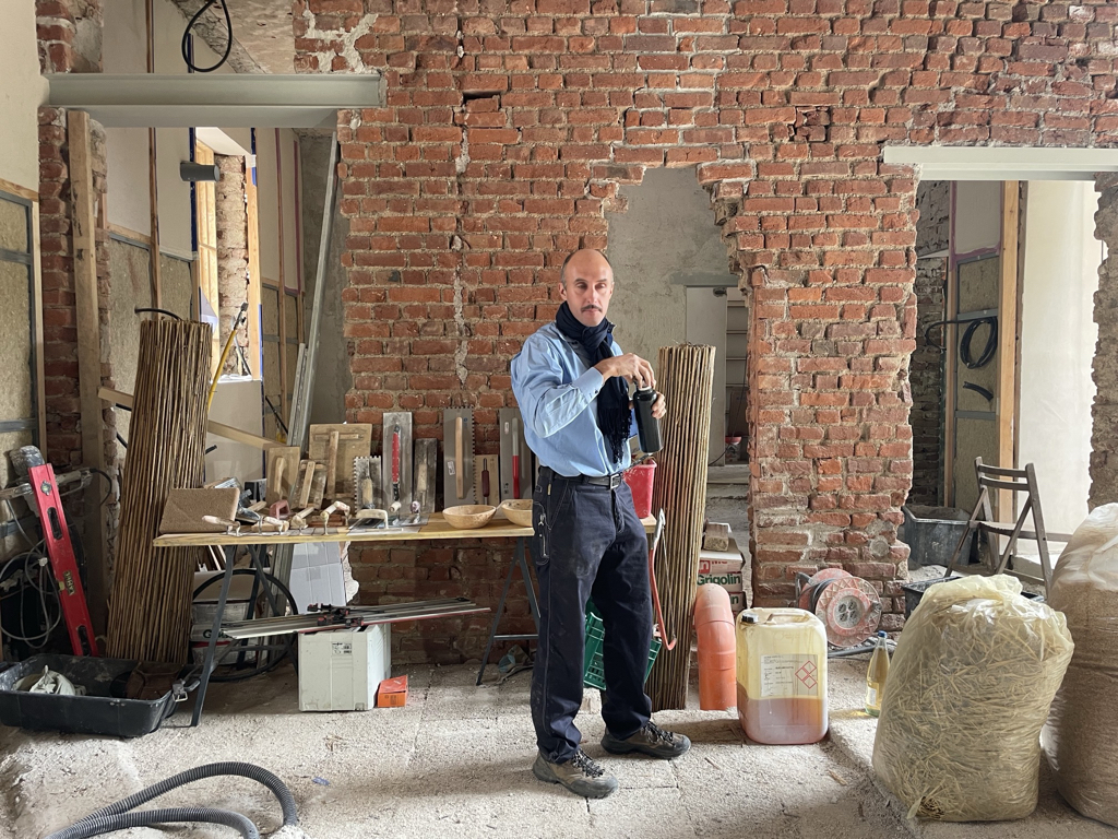 Ci siamo interrogati sulla regolazione dell’umidità e del caldo torrido imputabile al cambiamento climatico. Ci siamo interrogati sulle costruzioni “senza architetti”. Abbiamo approfondito le costruzioni vernacolari, le capanne in terra, le costruzioni in legno. Abbiamo scoperto che la maggior parte delle cascine di Lombardia e Piemonte erano costruire in terra locale, calce realizzata sul posto e inerti cavati e usati in loco. Ci siamo resi conto che abbiamo perso qualsiasi pratica e conoscenza locale. Ci siamo mossi e coinvolto esperti, artigiani e aziende di materiali naturali. Ci siamo interessati nella terra cruda, nell’argilla, la paglia, la canapa, la calce-canapa, la calce, la lolla di riso, il legno. Non appena abbiamo avuto l’opportunità di toccare con mano la maggior parte di questi materiali abbiamo intuito subito l’enorme potenziale ma soprattutto abbiamo capito la naturale empatia che certi materiali scambiano con l’uomo, in quanto quest’ultimo è parte stessa di un ambiente naturale. Siamo andati oltre. Abbiamo intuito la necessità di imparare di più. Come? Facendo. Abbiamo organizzato laboratori con artigiani per apprendere tecniche e materiali facendo. Abbiamo invitato amici e colleghi. Abbiamo sfruttato il cantiere della casa di via Ferrara come cornice ideale per sperimentare. Abbiamo fatto due laboratori. Il primo per sperimentare due tecniche con la terra cruda. Un intonaco in terra setacciata del giardino di casa mischiata a calce, inerti, paglia e canapulo. Abbiamo realizzato in autocostruzione contropareti a secco con isolante in canapa e chiusura in pannelli di argilla lasciati naturali. Il secondo laboratorio abbiamo realizzato un pavimento romano, tecnica antica descritta da Vitruvio nel Libro V del De Architectura. L’opus signinum è una malta ottenuta miscelando calce viva spenta con frammenti di laterizi e terra rossa fine, il tutto battuto e levigato in più strati fino a ottenere una superficie liscia e impermeabile. Consiglia l’applicazione di uno strato di base più grossolano, seguito da una finitura fine. Bisogna lasciar stagionare ogni mano per due o tre giorni, in modo da garantire coesione e durevolezza nel tempo.