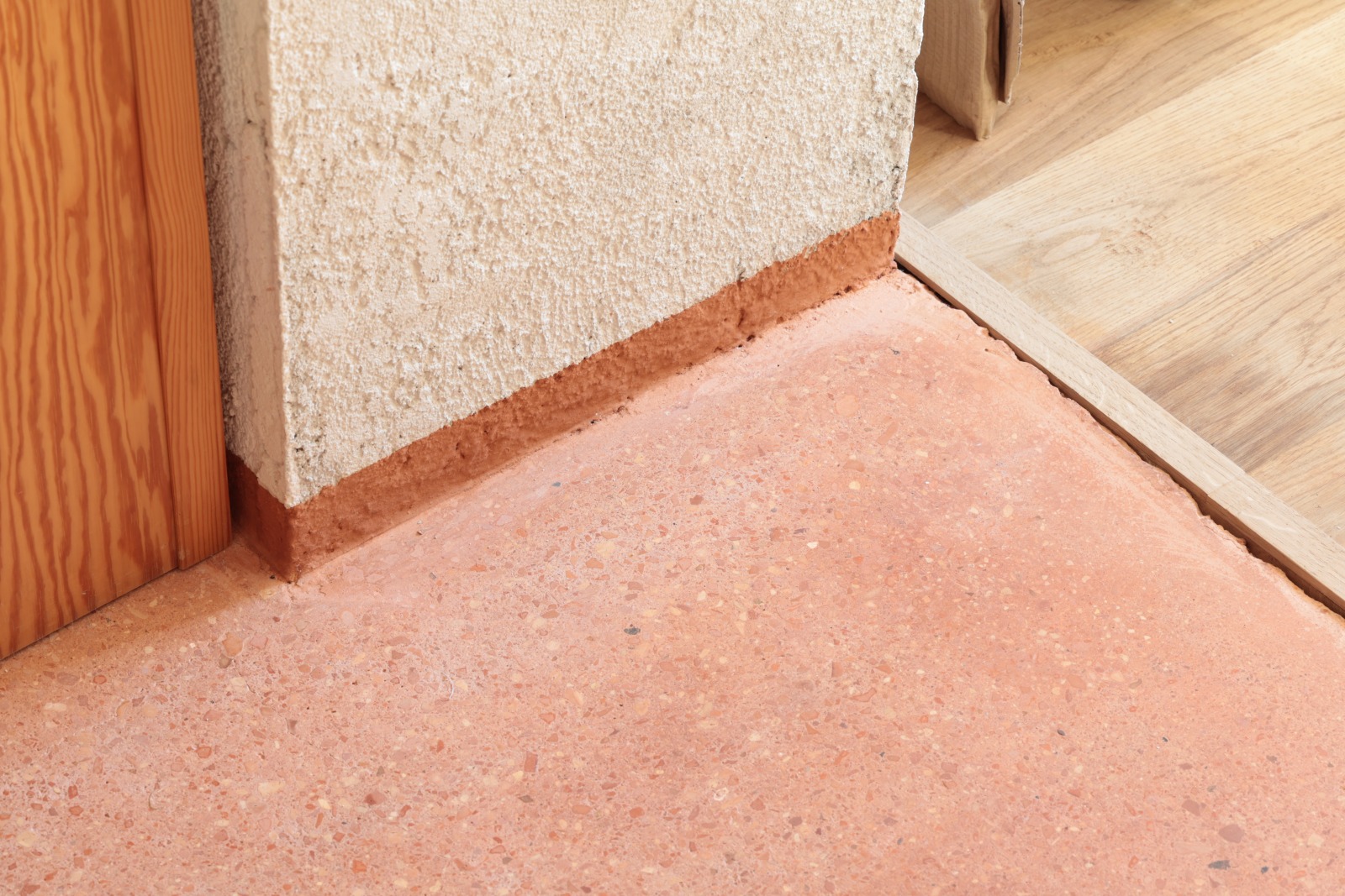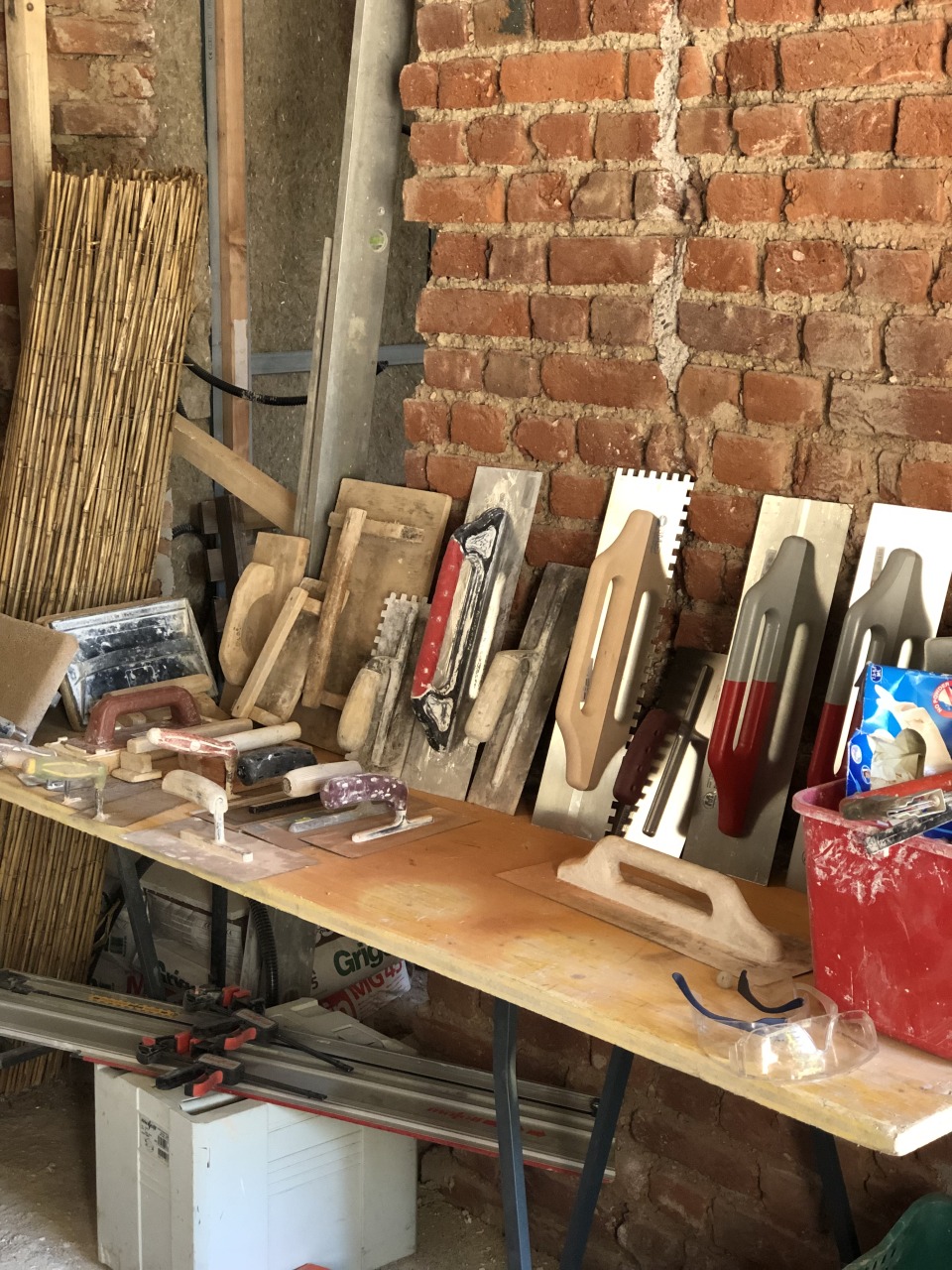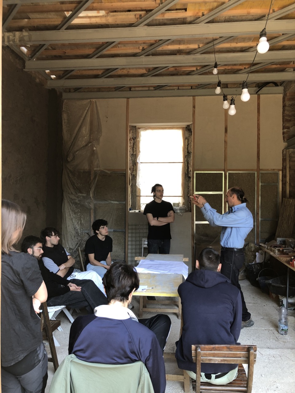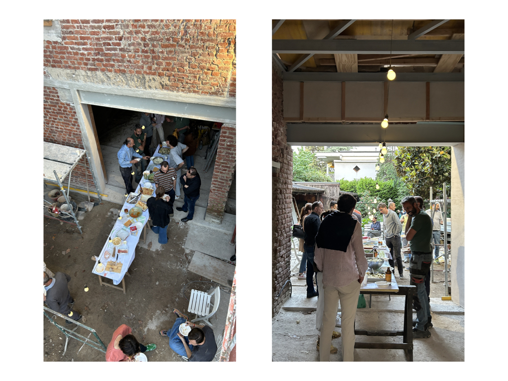 Ci siamo interrogati sulla regolazione dell’umidità e del caldo torrido imputabile al cambiamento climatico. Ci siamo interrogati sulle costruzioni “senza architetti”. Abbiamo approfondito le costruzioni vernacolari, le capanne in terra, le costruzioni in legno. Abbiamo scoperto che la maggior parte delle cascine di Lombardia e Piemonte erano costruire in terra locale, calce realizzata sul posto e inerti cavati e usati in loco. Ci siamo resi conto che abbiamo perso qualsiasi pratica e conoscenza locale. Ci siamo mossi e coinvolto esperti, artigiani e aziende di materiali naturali. Ci siamo interessati nella terra cruda, nell’argilla, la paglia, la canapa, la calce-canapa, la calce, la lolla di riso, il legno. Non appena abbiamo avuto l’opportunità di toccare con mano la maggior parte di questi materiali abbiamo intuito subito l’enorme potenziale ma soprattutto abbiamo capito la naturale empatia che certi materiali scambiano con l’uomo, in quanto quest’ultimo è parte stessa di un ambiente naturale. Siamo andati oltre. Abbiamo intuito la necessità di imparare di più. Come? Facendo. Abbiamo organizzato laboratori con artigiani per apprendere tecniche e materiali facendo. Abbiamo invitato amici e colleghi. Abbiamo sfruttato il cantiere della casa di via Ferrara come cornice ideale per sperimentare. Abbiamo fatto due laboratori. Il primo per sperimentare due tecniche con la terra cruda. Un intonaco in terra setacciata del giardino di casa mischiata a calce, inerti, paglia e canapulo. Abbiamo realizzato in autocostruzione contropareti a secco con isolante in canapa e chiusura in pannelli di argilla lasciati naturali. Il secondo laboratorio abbiamo realizzato un pavimento romano, tecnica antica descritta da Vitruvio nel Libro V del De Architectura. L’opus signinum è una malta ottenuta miscelando calce viva spenta con frammenti di laterizi e terra rossa fine, il tutto battuto e levigato in più strati fino a ottenere una superficie liscia e impermeabile. Consiglia l’applicazione di uno strato di base più grossolano, seguito da una finitura fine. Bisogna lasciar stagionare ogni mano per due o tre giorni, in modo da garantire coesione e durevolezza nel tempo.
