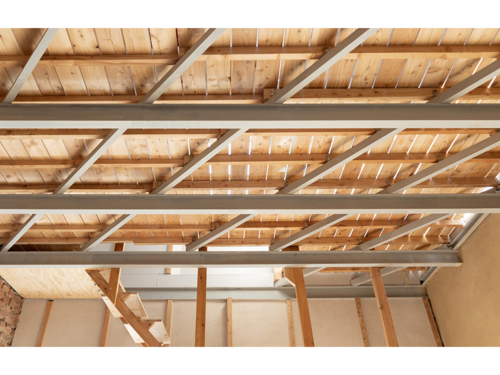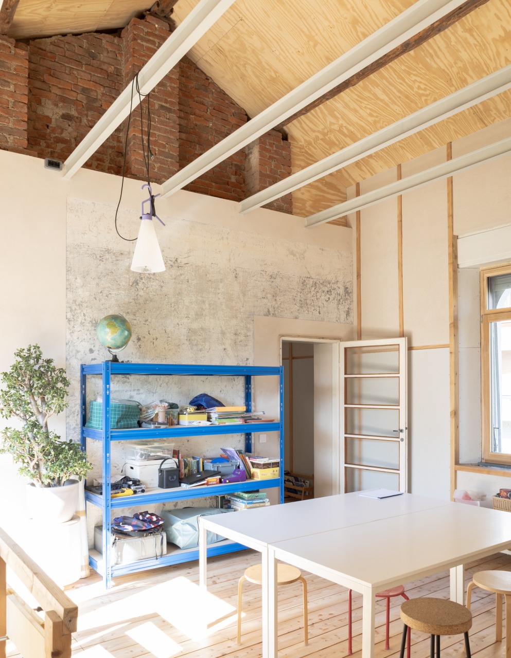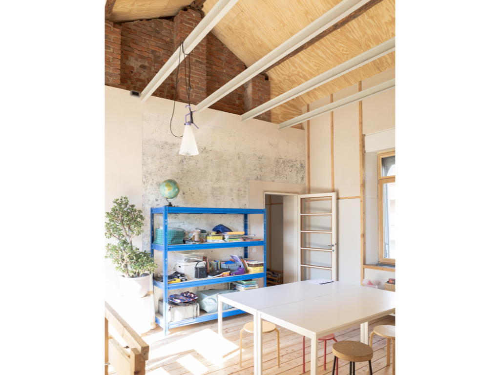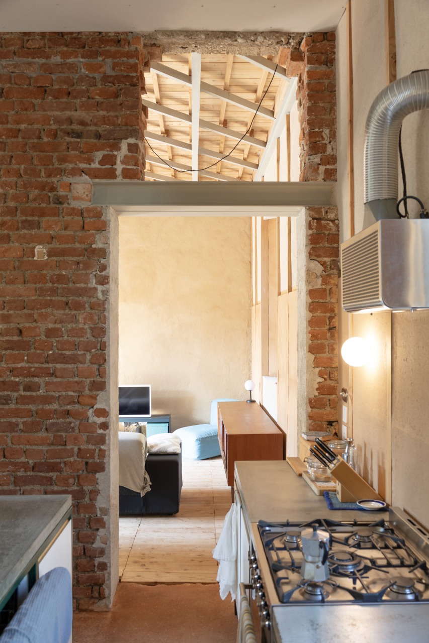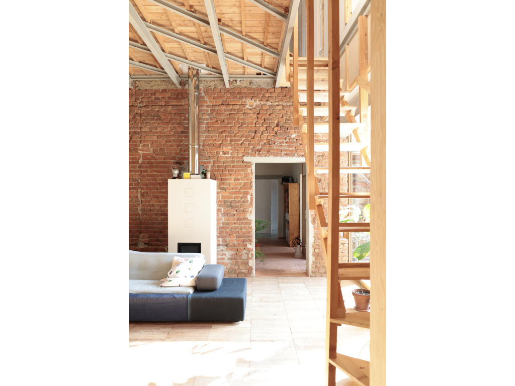 Il disegno di progetto più importante è stato fatto in vacanza al mare, in una pausa di relax dopo un pranzo. I bambini giocavano indipendenti e avevo la necessità di verificare su carta un’intuizione di uno spazio a doppia altezza senza sacrificare la superficie del solaio. L’idea di un solaio permeabile, con tavole di legno leggermente separate tra di loro ha permesso di immaginare uno studio in quota al piano primo acusticamente e visivamente connesso al soggiorno inferiore. Luce e aria possono invadere entrambi gli spazi intravedendo tra le assi di legno la vita del piano superiore che ospita un o studio collettivo dove ci si può riunire a studiare, leggere e giocare. Su questo spazio “pubblico” in quota si affacciano le stanze da letto e un bagno di servizio.