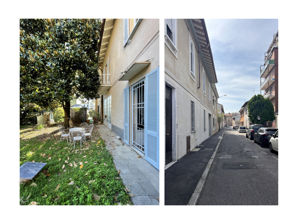 Una vecchia casa di corte di inizio del XX secolo. Un’unica grande casa negli anni divisa e frazionata fino a definire più piccole unità abitative lungo la via Ferrara. Il fronte nord si affaccia direttamente su via Ferrara mentre la facciata sud apre sul giardino interno ricco di piante, luce ed aria. La casa è sempre stata vissuta da un’unica famiglia costituita da due genitori e tre figli. Il padre si occupava della casa e del giardino, manutenzioni ordinarie e straordinarie, con cura e passione, fino a costruire un’altalena, giochi di legno e aquiloni. Nel giardino infatti è presente un piccolo capanno auto-costruito, un laboratorio per il fai-da-te, oggi ricco di materiali e strumenti ancora da scoprire.