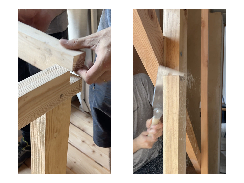 Ci siamo spinti oltre grazie a processi di auto-costruzione. Ho coinvolto collaboratori e amici a partecipare a giornate di lavoro in cantiere per poter apprendere tecniche di posa di materiali naturali e di recupero. Abbiamo posato in auto-costruzione 120 metri quadri di tavole in larice. Abbiamo posato il solaio permeabile con le stesse tavole di larice. Abbiamo ragionato prima di fare, abbiamo sprecato il meno possibile. L’avanzo di materiali è diventato utile per ulteriori lavorazioni. Il larice avanzato è stato recuperato per realizzare una scala interna che connette il soggiorno inferiore al soggiorno superiore. La scala è stata realizzata “dal vivo” con la collaborazione di una falegnameria sociale con cui è possibile lavorare insieme direttamente sul cantiere. Il processo di progettazione in questo modo è radicalmente messo in discussione. Il progetto esecutivo è sostituito in una dimensione del fare “dal vivo”. Ne è un esempio la mensola appesa ad un montante strutturale della scala che era troppo lungo ma solo un’osservazione sul posto ha permesso di decidere di non tagliare il montante quanto piuttosto di lasciarlo della sua lunghezza apparentemente errata e utilizzarlo per fissare una mensola per una pianta.
